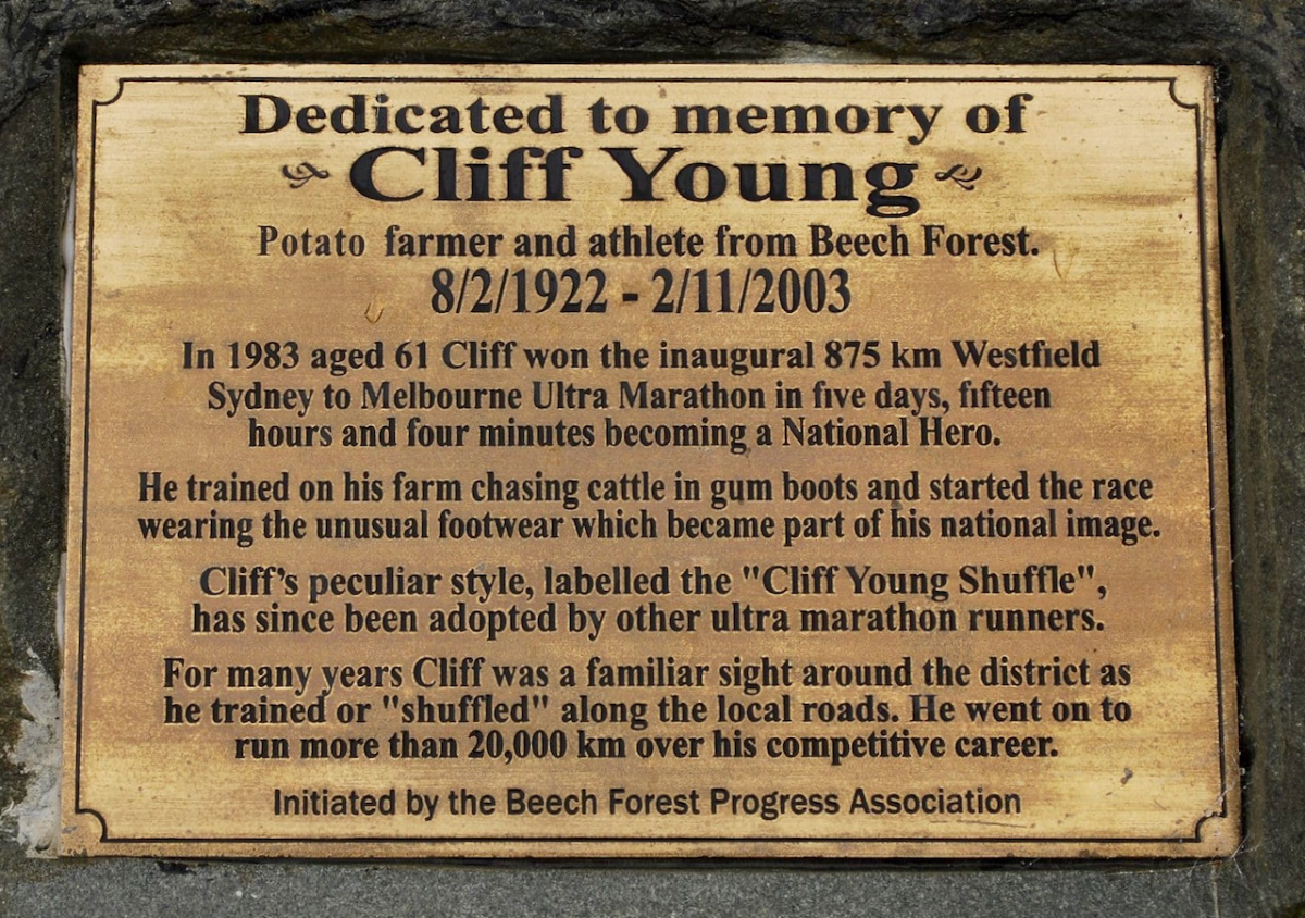 Cliff Young, zwycięzca ultra maratonu Sydney – Melbourne, trasy 875 km w 1983 roku przebiegł trasę w zwykłych roboczych butach i w dresowych spodniach. Zajęło mu to pięć dni, piętnaście godzin i cztery minuty. Następny biegacz, weteran maratonu, przybiegł na metę 10 godzin później. Cliff poprawił poprzedni wynik o prawie dwa dni. Farmer ziemniaczany i hodowca owiec uganiał w młodości za stadem nawet po trzy dni i noce, bez snu. W czasie maratonu nie zdrzemnął się ani na chwilę. Miał wtedy 61 lat. W 2013 powstał film telewizyjny „Cliffy”. Nie wiedziałem, że takie trasy istnieją!