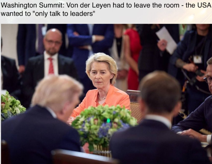 W Tagesschau z 20 sierpnia br. pojawił się tytuł, w którym jest wszystko wyrażone: „Trump-zeigt-von-der-leyen-die-tur-eu-kommissionsprasidentin-musste-ukraine-gipfel-verlassen“ – „Trump pokazuje von der Leyen drzwi – przewodnicząca Komisji Europejskiej musiała opuścić szczyt poświęcony Ukrainie”.