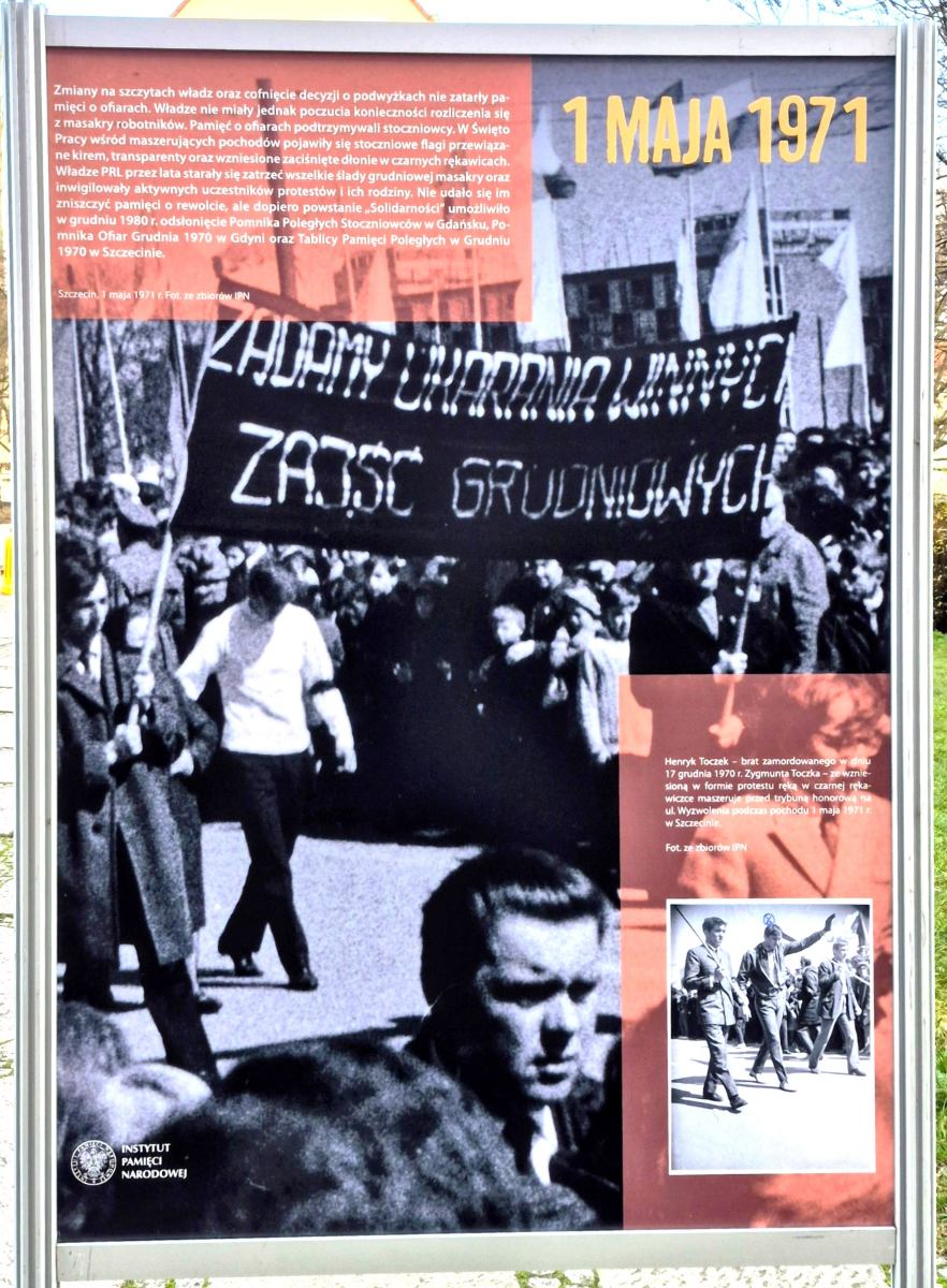 17 grudnia 1970 roku ze Stoczni Szczecińskiej im. A. Warskiego wyruszył robotniczy pochód. Była to reakcja na drastyczną podwyżkę cen podstawowych produktów żywnościowych i opału. Mimo prób zatrzymania przez Milicję Obywatelską demonstranci dotarli przed gmach Komitetu Wojewódzkiego PZPR, gdzie zgromadził się blisko 20-tysięczny tłum. Siedziba partii została podpalona. Szturm odpierały oddziały milicji i wojska. Do najbardziej dramatycznych wydarzeń doszło przed pobliską komendą milicji. Starcia w całym mieście trwały do wieczora. Szesnaście osób zabito. Ponad sto zostało ciężko rannych.