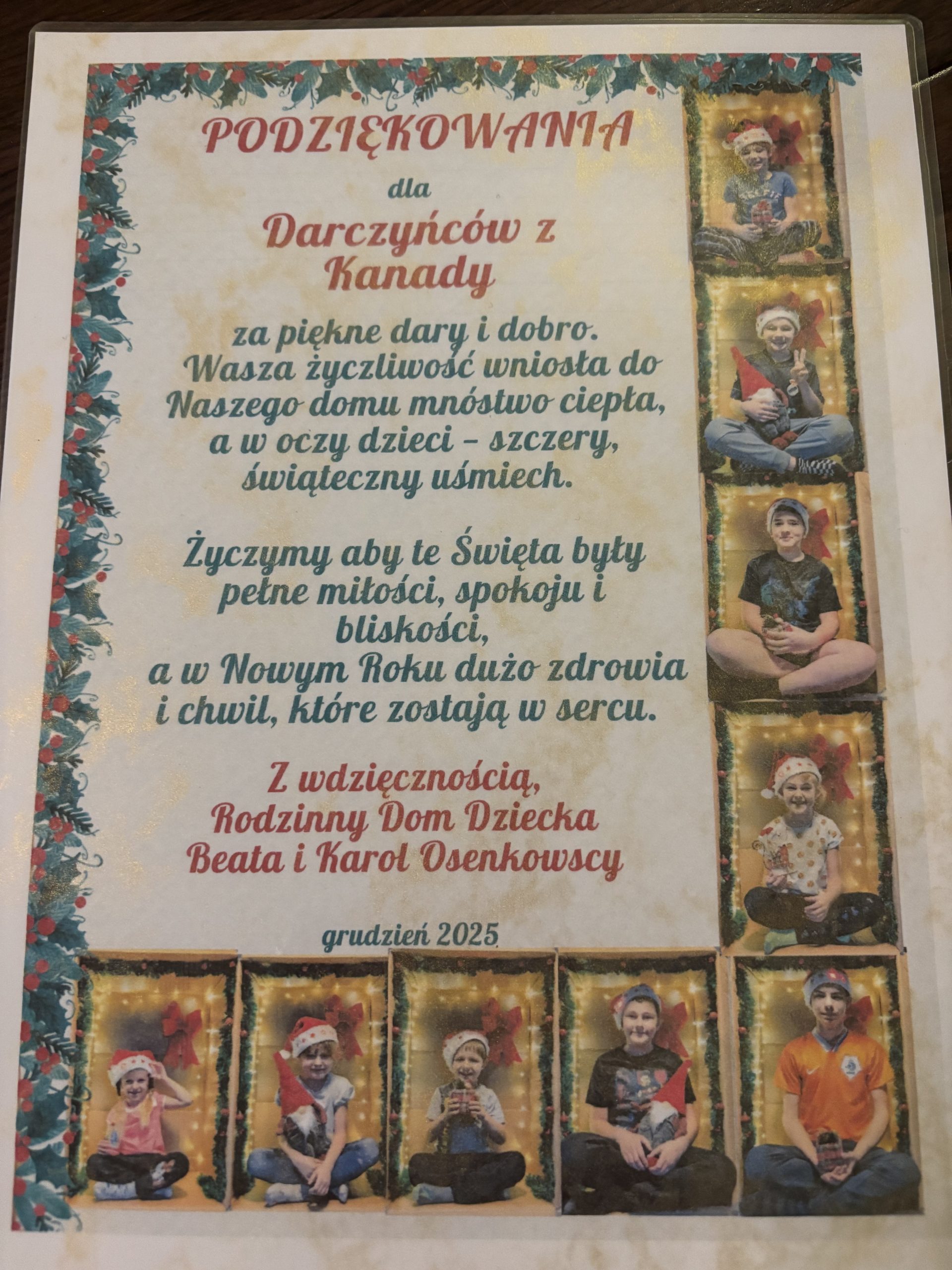 Dotarły do nas już pierwsze podziękowania z Domów Dziecka min. z Placówki Opiekuńczo- Wychowawczej w Rzeszowie. Dyrektor tej placówki Pani Małgorzata Bąk przekazała piękne podziękowanie dla Państwa, które opublikujemy podczas Świat Bożego Narodzenia min. na Facebook grupa Polki w Kanadzie, Polacy w Kanadzie