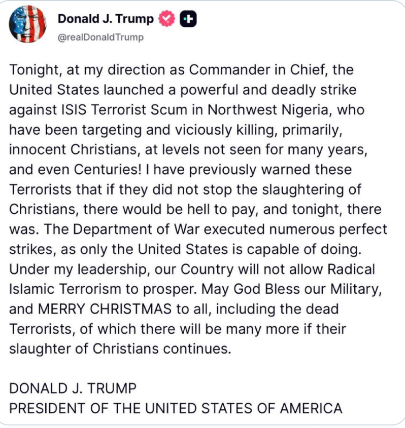 Trump powiedział w Truth Social, że terroryści, których celem są ataki, „brutalnie zabijają przede wszystkim niewinnych chrześcijan, na skalę nieobserwowaną od wielu lat, a nawet stuleci!”