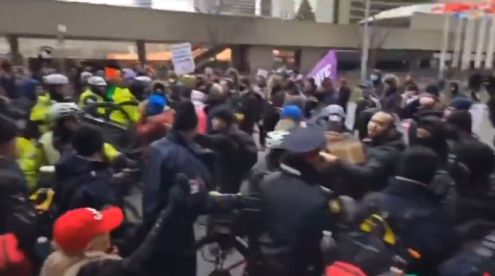 Toronto Police próbowała trzymać obie grupy oddzielnie. Gdy Canada First ruszyli w marsz, kontrmanifestanci próbowali blokować drogę, dochodziło do przepychanek.