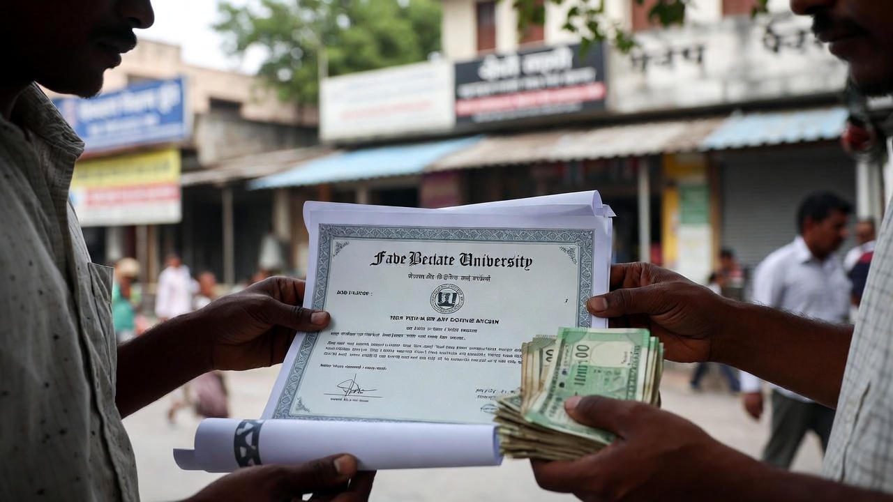 W Indiach od lat ujawniane są liczne afery związane z fałszowaniem dyplomów. Na przykład, w stanie Kerala policja skonfiskowała ponad 100 tys. fałszywych certyfikatów z 22 uniwersytetów, które były sprzedawane za kwoty od 75 tys. do 150 tys. rupii (ok. 3,5–7 tys. zł). Te dokumenty dotyczyły m.in. medycyny, pielęgniarstwa i inżynierii, a szacuje się, że w obiegu może być nawet milion takich fałszywych kwalifikacji