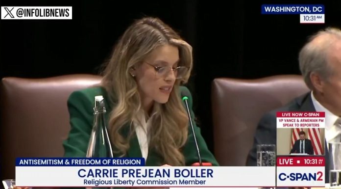 Carrie Prejean Boller, zakwestionowała tzw. roboczą definicję antysemityzmu, broniła postaci oskarżanych o antysemityzm (jak Candace Owens) i argumentowała, że anty-syjonizm nie równa się antysemityzmowi. Przewodniczący komisji, wicegubernator Teksasu Dan Patrick, przerywał jej kilkakrotnie, oskarżając o zbaczanie z tematu wolności religijnej na politykę zagraniczną. Do emocjonalnej wymiany zdań Boller z żydowskimi świadkami, doszło w ramach panelu dyskusyjnego, gdzie świadkowie m.in. Shabbos Kestenbaum, absolwent Harvardu; Yitzy Frankel, student prawa UCLA; Ari Berman, prezydent Yeshiva University; oraz rabin Meir Soloveichik, jedyny żydowski członek komisji, składali zeznania o doświadczeniach antysemityzmu.