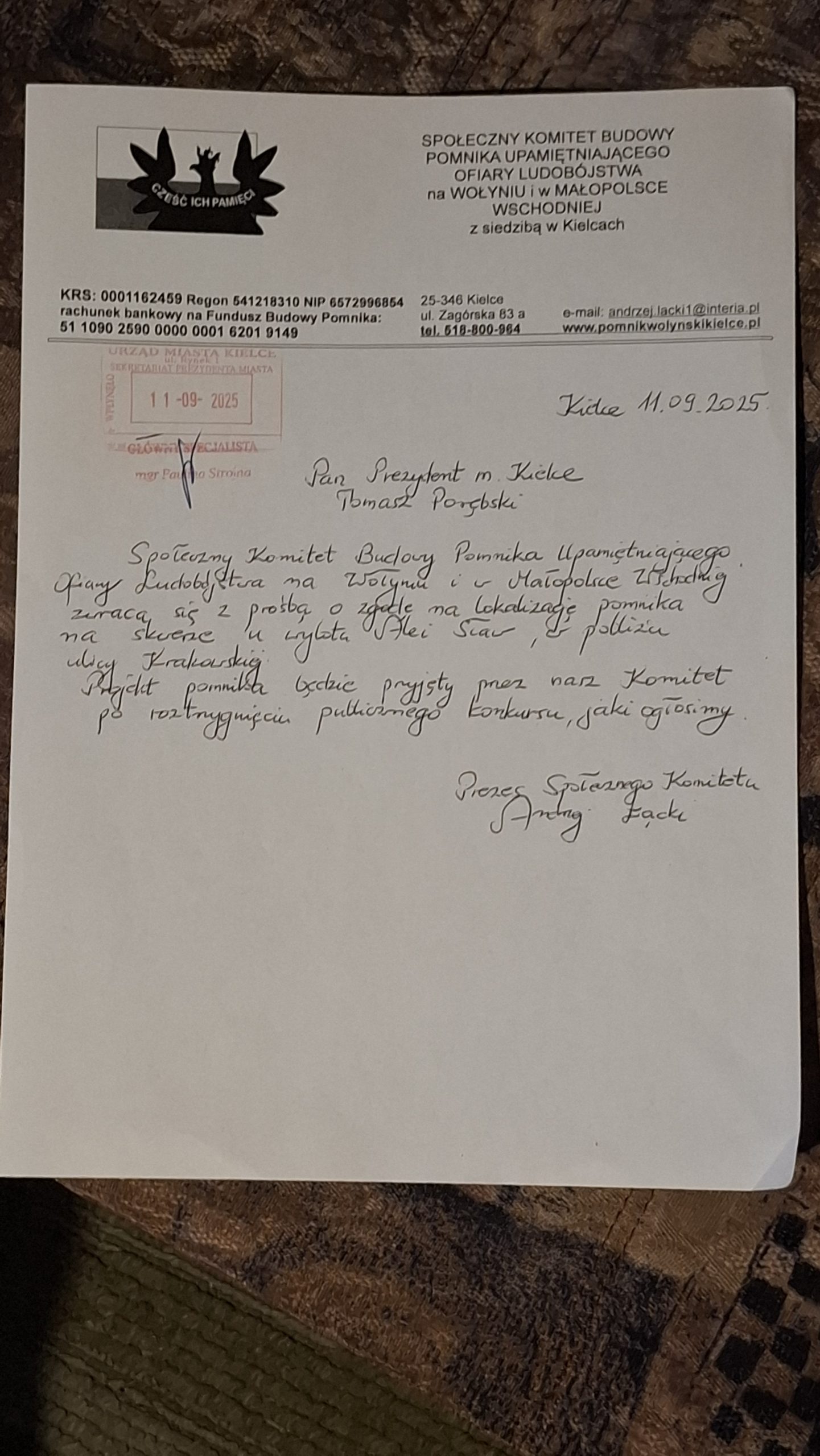 W październiku 2025 otrzymaliśmy zgodę Prezydenta Kielc na lokalizację Pomnika.