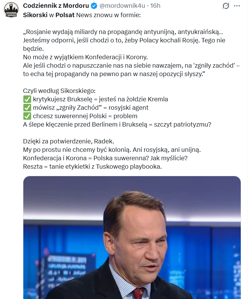 Sikorskiego ostatnio entuzjastycznie komentował przyjęcie euro przez Bułgarię, a w kontekście pożyczki SAFE – unijna pożyczka na zbrojenia-  tłumaczył, że pożyczanie w euro nie jest „zdradą”, bo i tak kiedyś wejdziemy do euro, a oprocentowanie jest niższe niż to, co brał PiS np. w Korei Południowej