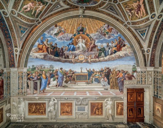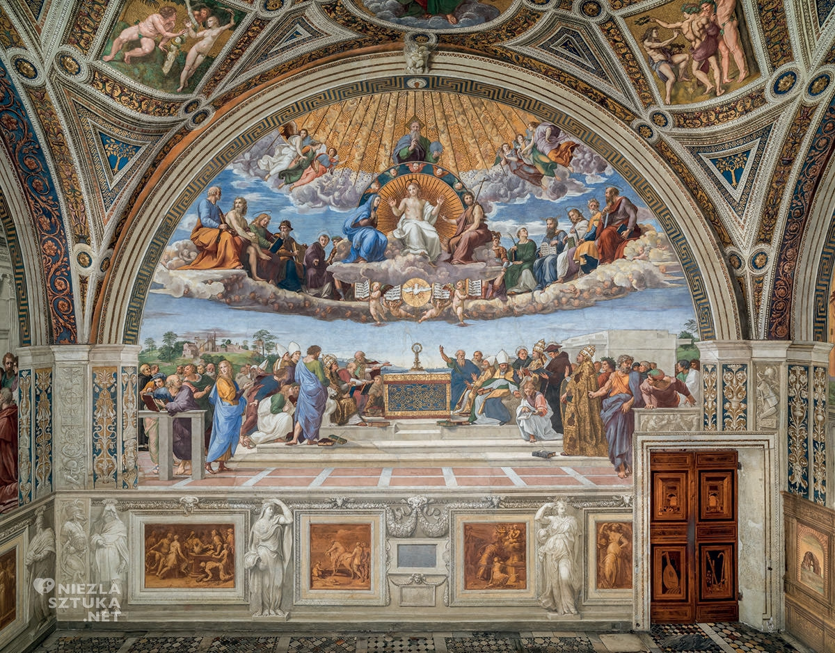 Najważniejszym freskiem w tej sali jest dzieło nazywane „Dysputą o Najświętszym Sakramencie”, choć wielu uważa, że lepsza nazwa to „Triumf Kościoła”. To nie jest zwykły obraz religijny. To raczej namalowane wyjaśnienie tego, kim jest Bóg, czym jest Kościół i dlaczego katolicy wierzą, że w Eucharystii naprawdę obecny jest Jezus. Obraz ma bardzo prostą, czytelną budowę. Wzdłuż jednej pionowej linii Rafael ustawił najważniejsze elementy. Na samej górze widzimy Boga Ojca. Niżej, Chrystusa. Jeszcze niżej, Ducha Świętego w postaci gołębicy. A na samym dole, dokładnie pod nimi, stoi monstrancja z hostią. Ten układ pokazuje dwie podstawowe prawdy wiary katolickiej:, że Bóg jest jeden, ale w trzech Osobach (Trójca Święta), oraz że w Eucharystii Jezus jest obecny naprawdę, a nie tylko symbolicznie. Hostia na ołtarzu jest tu pokazana jako miejsce spotkania nieba i ziemi. To, co niewidzialne, staje się widzialne w prostym znaku chleba. Według wiary katolickiej Bóg nie pozostaje daleko od człowieka, ale wchodzi w jego świat. Fresk jest podzielony na dwie części. U góry widzimy tzw. Kościół Triumfujący, czyli tych, którzy są już w niebie. Wśród nich są prorocy, apostołowie i święci, jak Adam czy Mojżesz. Panuje tam spokój i harmonia. Oni już znają prawdę w pełni, nie muszą dyskutować, tylko kontemplują. Na dole znajduje się Kościół Walczący, czyli ludzie żyjący na ziemi. Widzimy papieży, biskupów, teologów, poetów, a nawet Dante Alighieri. Rozmawiają, czytają księgi, gestykulują. Szukają zrozumienia. Ale wszyscy patrzą w jednym kierunku, na Najświętszy Sakrament. To pokazuje, że centrum życia Kościoła jest Eucharystia. Ten fresk znajduje się naprzeciwko innego słynnego dzieła Rafaela, Szkoła Ateńska. Tam widzimy świat filozofii, a w jego centrum stoją Platon i Arystoteles. „Szkoła Ateńska” pokazuje, jak daleko człowiek może dojść dzięki rozumowi. „Dysputa” pokazuje coś więcej, że ostateczna prawda jest darem Boga. Rozum jest ważny, ale potrzebuje światła wiary. Te dwa freski nie przeczą sobie, one się uzupełniają. Wiara i rozum nie są wrogami, lecz współpracują ze sobą. Całe dzieło Rafaela mówi więc o harmonii, między niebem i ziemią, między wiarą i myśleniem, między sztuką i teologią. Renesans nie musiał oznaczać odejścia od wiary. W tym przypadku pokazuje coś odwrotnego, że piękno i porządek mogą prowadzić do Boga. Dziś, gdy jedni ufają tylko nauce, a inni twierdzą, że prawda jest względna, ten fresk przypomina prostą myśl, prawda jest jedna, bo ma jedno źródło. A sztuka może pomóc nam tę prawdę zobaczyć, nie tylko o niej usłyszeć, ale naprawdę ją poczuć.