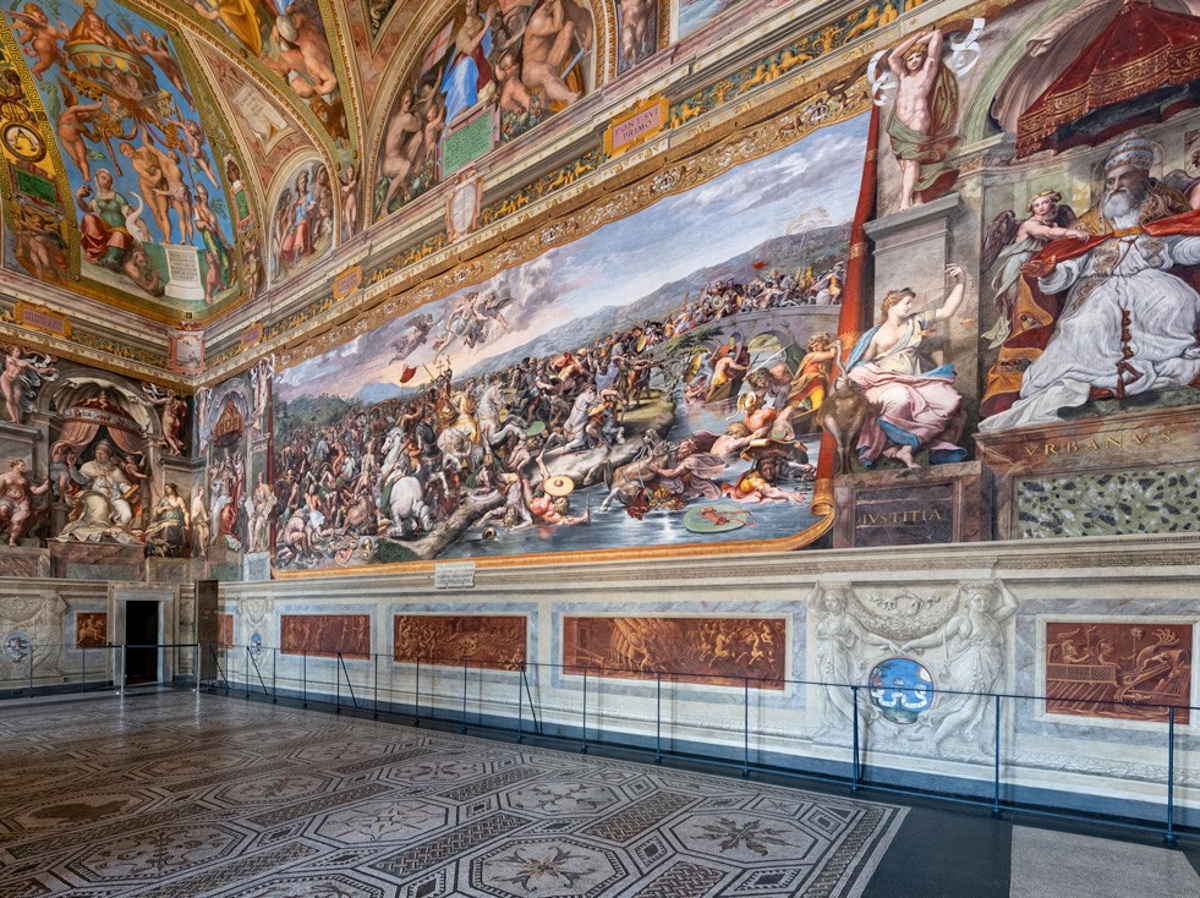 Stanza di Costantino (Pokój Konstantyna), Przedstawia: Wizję krzyża: Konstantyn widzi na niebie znak krzyża z napisem „In hoc signo vinces” przed bitwą, Bitwa pod mostem Mulwijskim (312 r.): Kluczowe zwycięstwo Konstantyna nad Maksencjuszem, symbolizujące triumf wiary, Chrzest Konstantyna: Cesarz przyjmuje chrzest z rąk papieża Sylwestra I (fresk przypisywany G.F. Penniemu), Donacja Rzymu (Dar Konstantyna): Konstantyn przekazuje władzę nad Rzymem papieżowi Sylwestrowi I, co miało historycznie legitymizować władzę papieży. Sala ta, będąca największą z pokoi Rafaela, służyła do oficjalnych audiencji i bankietów, a dekoracje podkreślają sojusz papiestwa z władzą cesarską.