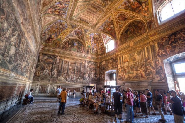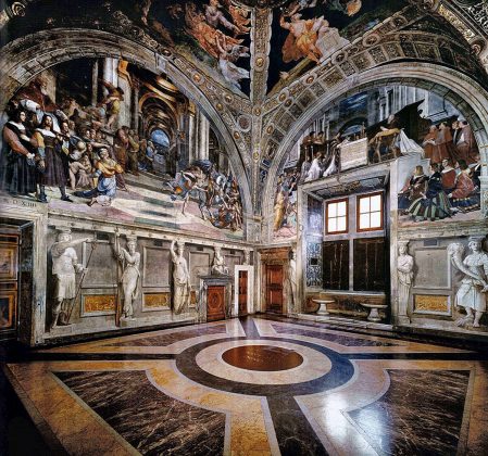 Stanze Watykańskie. Są to reprezentacyjne apartamenty papieskie znajdujące się w północnym skrzydle Pałacu Watykańskiego, na drugim piętrze budynku. Tworzą je cztery sale, które zostały udekorowane freskami Rafaela Santi oraz jego pomocników i uczniów. Polecenie udekorowania stanz wydał papież Juliusz II, który zdecydował się przenieść do nich, opuszczając komnaty zamieszkiwane wcześniej przez swoich poprzedników. Rafael rozpoczął prace w 1508 roku. Autorstwo artysty jest w dużej mierze potwierdzone, z wyjątkiem niektórych fragmentów. Do dziś jednak nie zostało w pełni rozstrzygnięte, które partie malowideł są bezpośrednim dziełem mistrza, a które wykonali jego uczniowie pod jego kierunkiem.