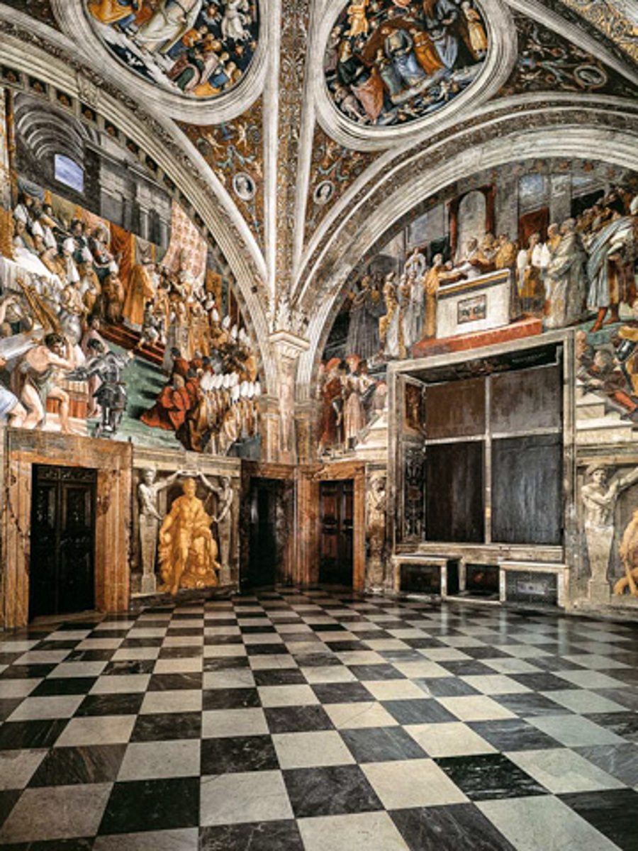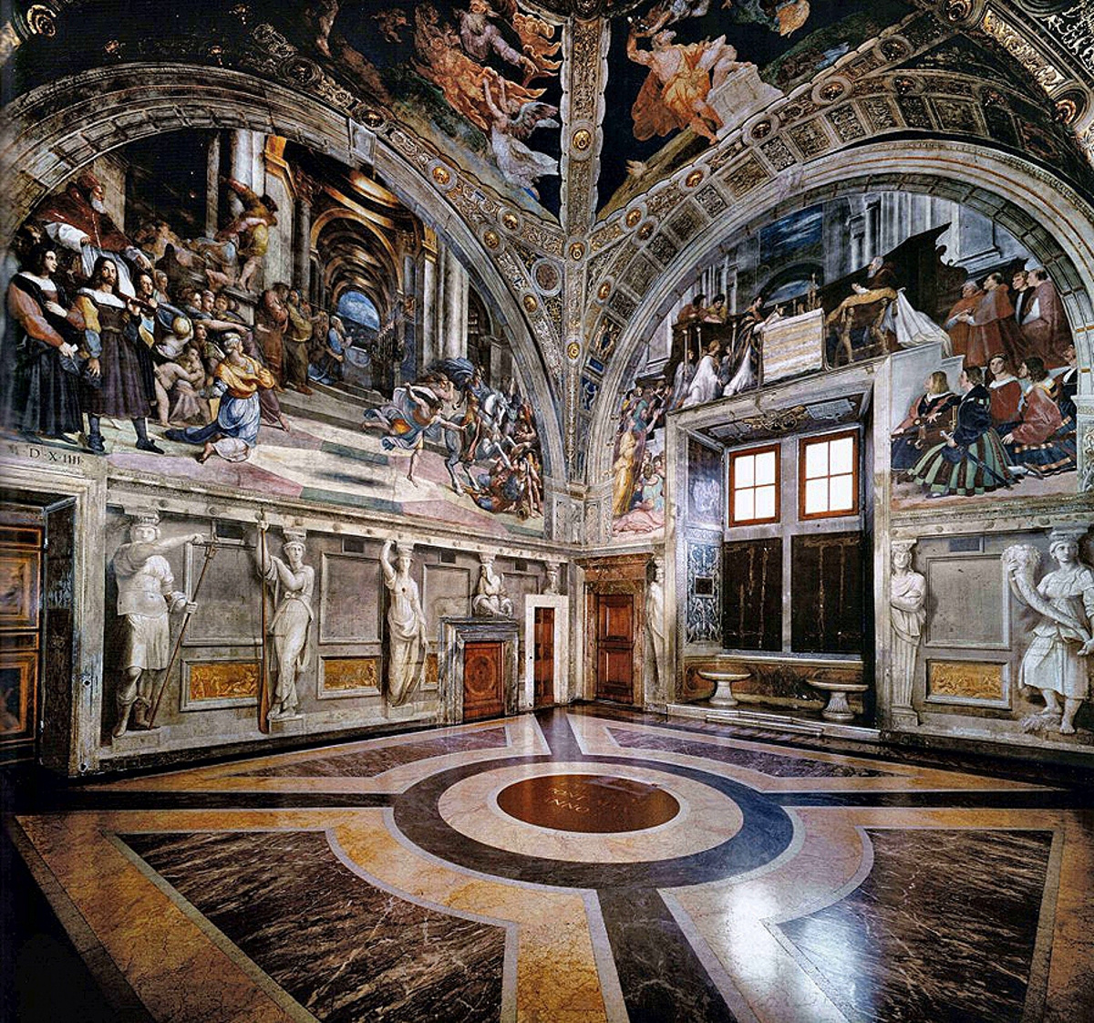 Stanza della Segnatura (Pokój Sygnatury), przedstawia: Szkołę Ateńską (filozofia, rozum): Platon i Arystoteles otoczeni greckimi uczonymi, Disputa (teologia, wiara): Dysputa o Najświętszym Sakramencie, Parnas (piękno, sztuka): Apollo z muzami i poetami, Cnoty kardynalne i teologalne (prawo, dobro): alegorie sprawiedliwości. Pomieszczenie to służące niegdyś jako biblioteka i sąd papieski, jest uważane za szczytowe osiągnięcie renesansu.