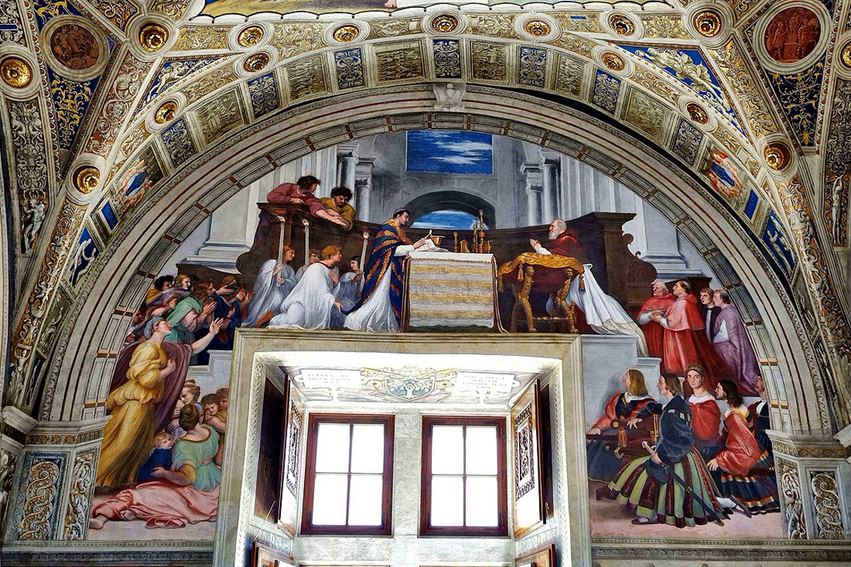 Stanza di Eliodoro (Pokój Heliodora), przedstawia: Wypędzenie Heliodora ze Świątyni Biblijna scena (2 Mach 3), w której wysłannik króla Syrii próbuje zrabować skarby świątyni jerozolimskiej, ale zostaje przepędzony przez jeźdźca i dwóch młodzieńców zesłanych przez Boga. Malowidło to symbolizuje ochronę majątku kościelnego, Msza bolsenańska (Msza Bolseńska): Przedstawia cud z 1263 roku, gdy podczas mszy w Bolsenie hostia zaczęła krwawić w rękach wątpiącego kapłana, potwierdzając tym samym prawdę o transsubstancjacji, Uwolnienie św. Piotra: Scena przedstawia anioła wyzwalającego pierwszego papieża, św. Piotra, z więzienia, co jest alegorią bezpośredniej boskiej opieki nad papieskim urzędem,Spotkanie Leona Wielkiego z Attylą: Obrazuje moment, w którym papież Leon I, z pomocą zjawiających się świętych Piotra i Pawła, powstrzymuje Attylę, przywódcę Hunów, przed najazdem na Rzym, co symbolizuje obronę Kościoła przed wrogami zewnętrznymi. Pomieszczenie to służyło jako prywatna sala audiencyjna papieża Juliusza II,