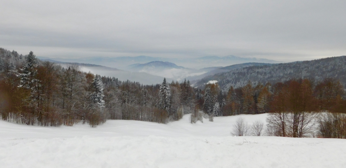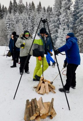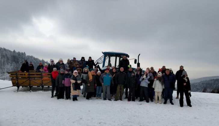 Najpierw kulig. W pewnym miejscu przesiadamy się z autokaru na sanie. Trochę zawodu, bo w wyobraźni to sanie ciągnięte przez konie, a tu kulig nowoczesny i zmotoryzowany. Sanie wielkie, na kilkanaście osób i traktor. Ponad pół godziny jazdy przez las na polanę rozległej Jaworzyny Krynickiej. Na szczycie -14 C°, ale nie ma wiatru. Jest jednak mgła i nici z widoku Tatr Wysokich. Są za to dwa paleniska z rusztem do pieczenia kiełbasek. Nie zapomniano też o nalewkach, choć to we własnym zakresie.