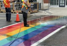Tęczowe przejście dla pieszych w Uptown Waterloo – zostało zwandalizowane przez ślady opon.