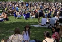 Mimo że obowiązują wciąż przepisy dystansowania społecznego nakazujące ludziom z różnych gospodarstw domowych przebywać dwa metry od siebie, w sobotę w Trinity Bellwoods Park...