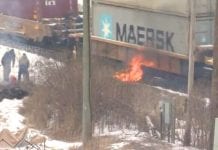 Protestujący aktywiści, którzy rozbili obóz w pobliżu miejsca poniedziałkowego nalotu policyjnego,w okolicach Belleville w Ontario podpalają opony wokół torów, gdzie przejeżdżają pociągi towarowe.
